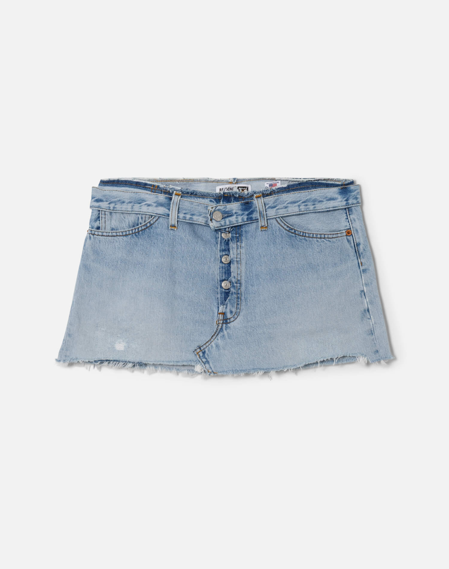 The RE/DONE | Levi's Raw Edge Mini Skirt in Indigo is our upcycled version of the iconic low-rise micro mini style, featuring an ultra-short length, exposed button fly, and removable denim belt. Every skirt is completely one-of-a-kind and was reconstructed locally in Los Angeles.